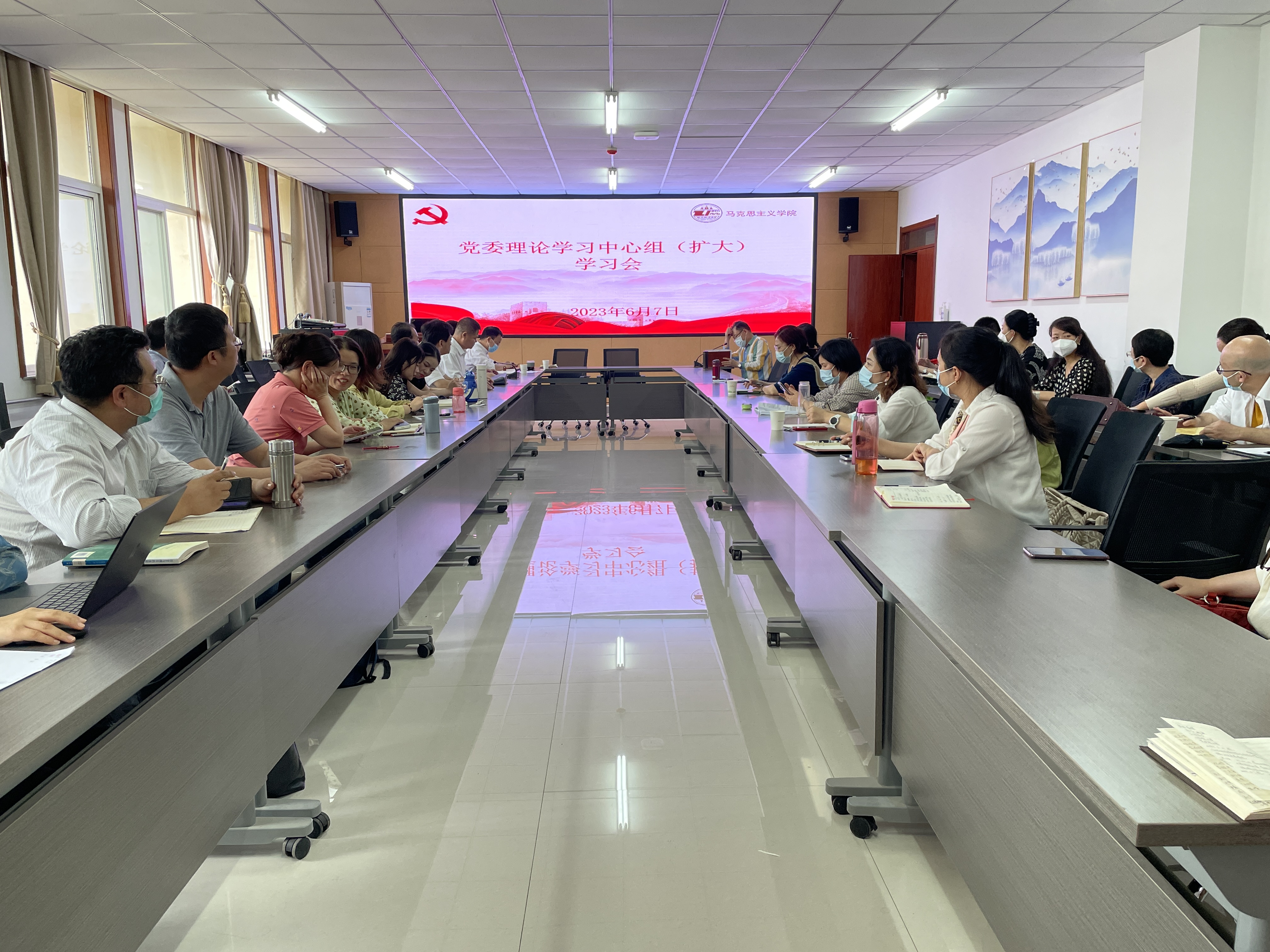 6月7日下午,马克思主义学院在长安校区诚意楼五层会议室召开党委理论学习中心组(扩大)学习会议。学院班子成员和全体教师参加了会议。会议由学院党委书记刘驰主持。