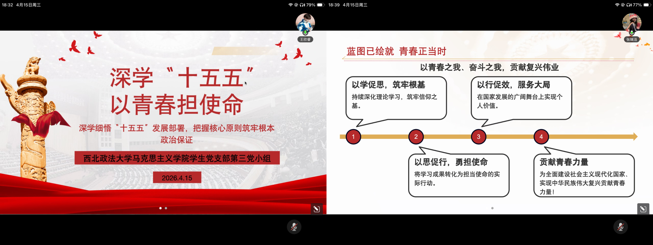 第三党小组以线上会议开展学习,由王欣睿同志领学,对“十五五”规划核心内容与“六个坚持”原则进行逐段研读和要点梳理。党员们结合学习笔记交流感悟,张瑞洁同志作为代表发言。大家共同梳理国家发展的目标、指标与战略任务,进一步深化了对国家发展蓝图的理解,明确了自身在中国式现代化建设中的使命担当。