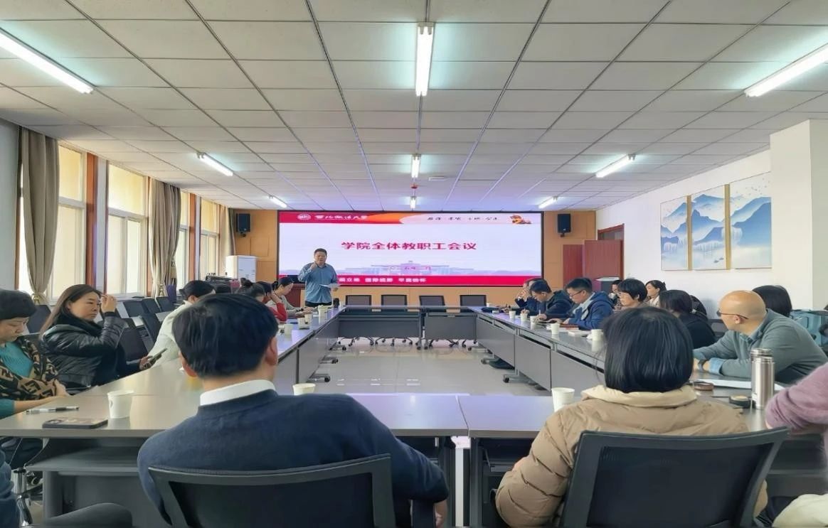 2025年2月23日下午,学院在诚意楼五楼会议室召开新学期全体教职工会议,总结上年度工作情况,安排部署本年度重点工作。会议由学院党委书记刘驰主持。