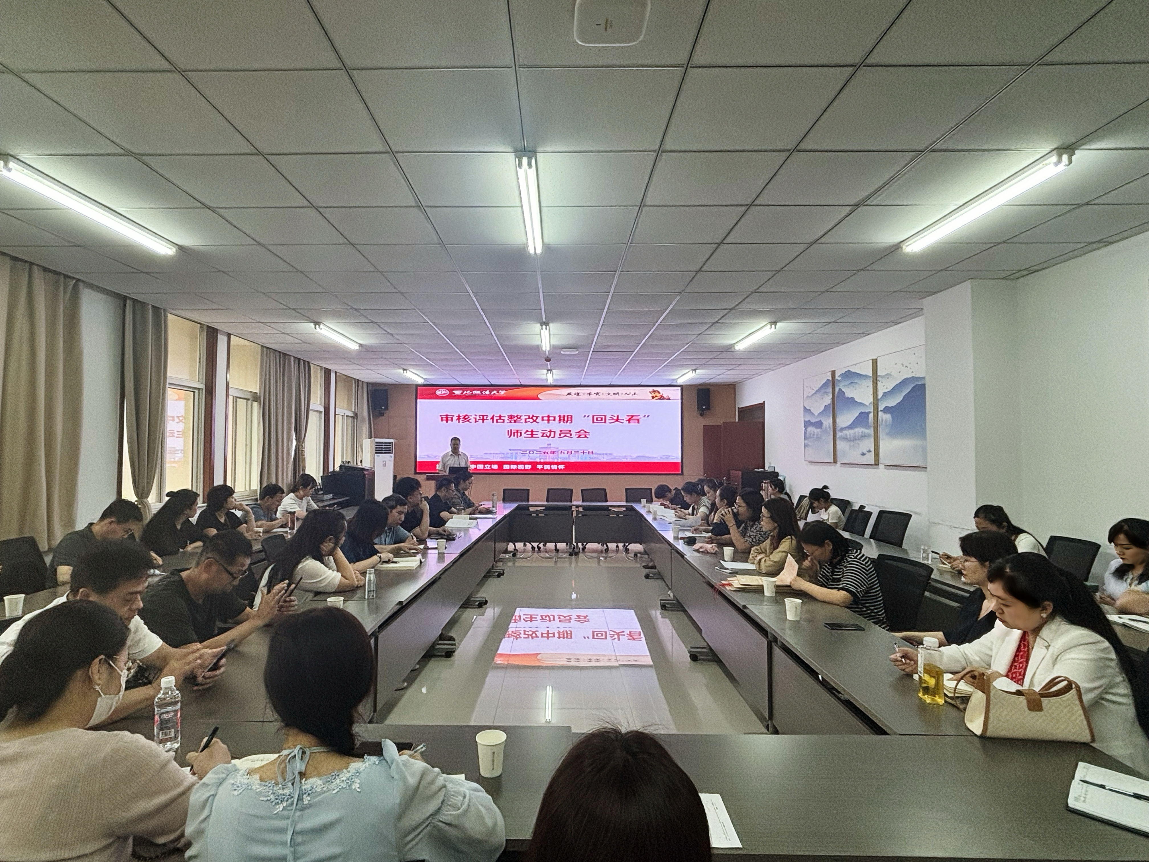 于诚意楼五楼会议室召开审核评估整改中期“回头看”师生动员会,会议由学院党委书记刘驰主持。