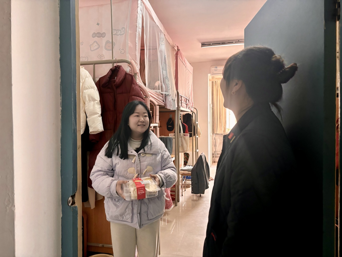 中午,学院辅导员刘栩源深入研究生宿舍,开展暖心走访慰问。走访过程中,老师向同学们致以节日祝福,送上元宵礼物,并与大家亲切交谈,叮嘱大家注意宿舍安全、合理安排作息。这份节日温暖,让同学们在初春的校园也过出了“家”的味道。