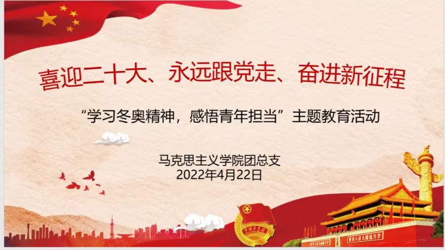 活动伊始,胡广蓉带领大家从胸怀大局、自信开放、迎难而上、追求卓越、共创未来五个方面了解了冬奥精神的内涵。随后以优秀青年谷爱凌的拼搏精神为例,鼓舞青年应具备自信乐观的生活态度;以青年志愿者们在冬奥会志愿服务中的优异表现,展现了新时代青年的责任担当及榜样力量。接着,2021级团员符甜和马列霞同学就冬奥精神分享自身心得体会,她们用真挚的感受描绘从冬奥精神中感悟到的中国力量和中国自信,体会建设体育强国的必要性及青年应从冬奥精神中汲取的精神伟力。最后,胡广蓉以汲取“冬奥力量”、筑梦复兴征程为指引,号召大家作为新时代社会主义接班人要和冬奥会中的青年志愿者和运动员们一样有勇气、有梦想、有追求,勇于应对各项困难与挑战,在奋勇搏击中不断提升自己、超越自我。