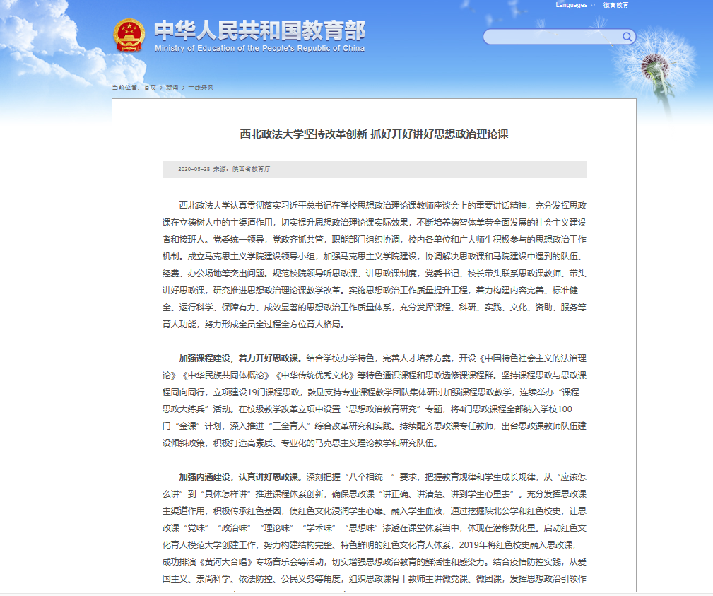 5月28日,中华人民共和国教育部网站以“笔趣阁 坚持改革创新 抓好开好讲好思想政治理论课”为题,对笔趣阁 思想政治理论课教学改革工作进行了报道。