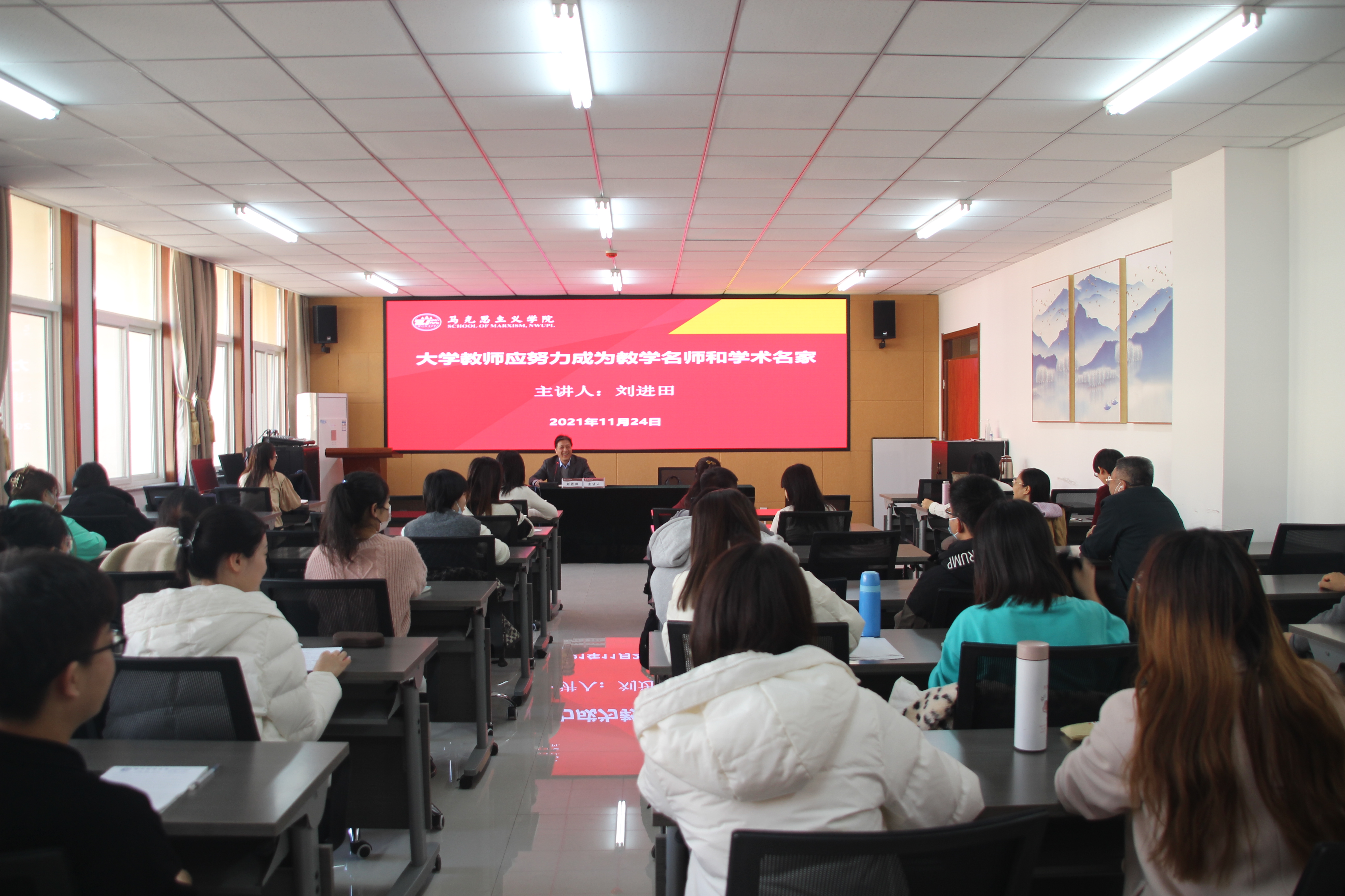 学术委员会副主任、二级教授、博士生导师、马克思主义理论一级学科首席专家、文化与价值哲学研究院院长刘进田教授作了题为《大学教师应努力成为教学名师和学术名家》的报告。学院新晋研究生导师、转岗教师以师生代表参加了培训会。会议由学院办公室主任苏芳主持。