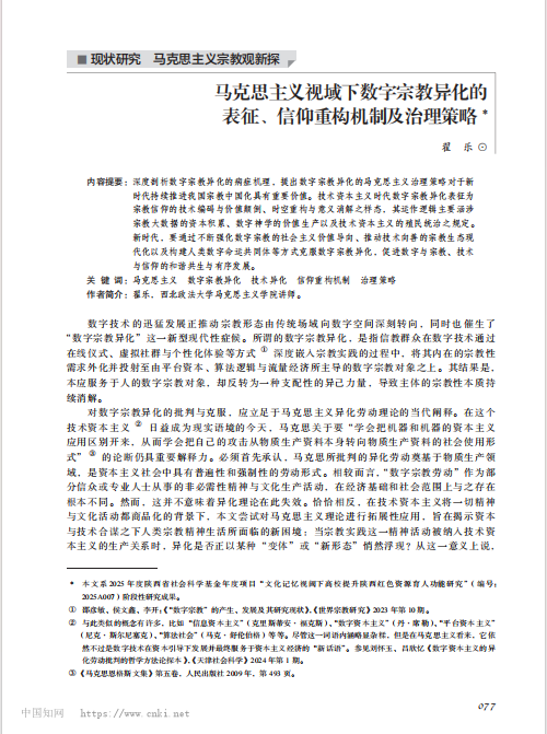 作者指出,深度剖析数字宗教异化的内在机理,提出基于马克思主义的治理策略,对于新时代持续推进我国宗教中国化、引导数字宗教健康有序发展,具有重要理论价值与现实意义。作为技术资本主义深度介入宗教领域所催生的一种新型现代性症候,数字宗教异化不仅是马克思主义异化理论在当代阐释与拓展应用中的重要对象,更是推动新时代宗教治理与数字治理深度融合所面临的现实问题。在马克思主义视域下,数字宗教异化呈现为数字劳动异化与信仰“平台化”的双重表征,其深层逻辑体现为宗教数据的资本积累、数字神学的价值生产以及技术资本主义的殖民统治等三重信仰重构机制。破解数字宗教异化,必须立足于社会主义中国的具体场域,牢牢把握宗教中国化的主线要求,尤其应充分发挥社会主义价值导向的引领作用、技术向善现代化实践的支撑作用,以及构建人类数字命运共同体的协同作用。