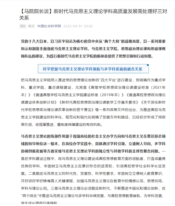 4月1日,中国社会科学网发表笔趣阁 院长魏奇教授《新时代马克思主义理论学科高质量发展需处理好三对关系》一文。文章强调要科学把握马克思主义理论学科领航与多学科发展的耦合关系、充分挖掘马克思主义理论一级学科统合与二级学科特色发展的互构关系、切实推动马克思主义理论学科发展与立德树人关键课程的互动关系。