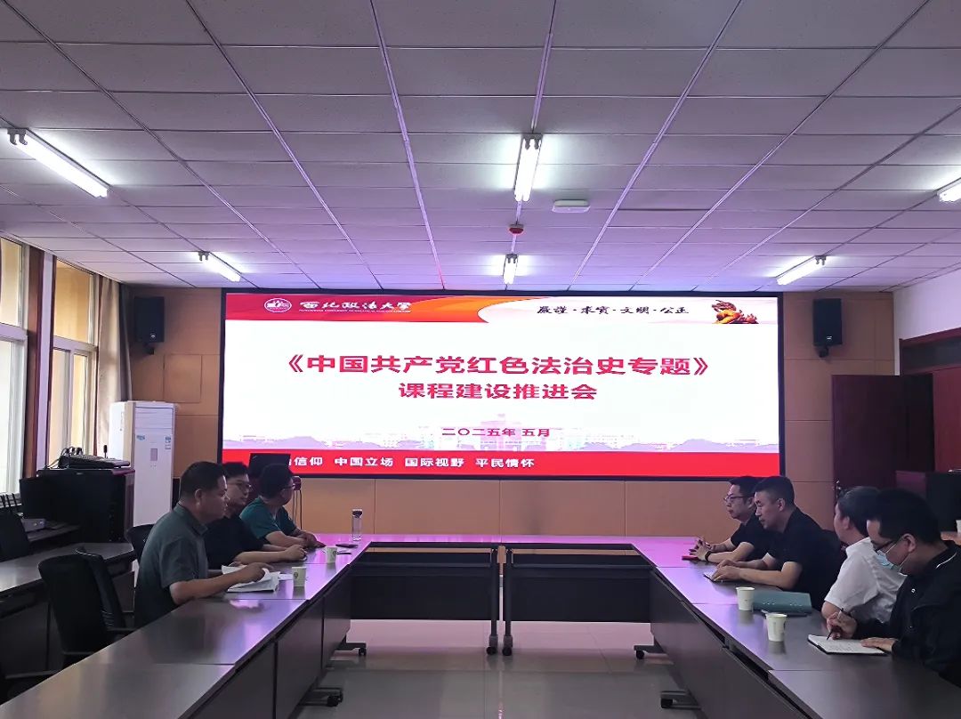 在诚意楼五楼会议室组织召开《中国共产党红色法治史专题》课程建设推进会。学院党委书记刘驰主持会议,梁丹丹、赵琳、朱风翔等八位骨干教师参与研讨。