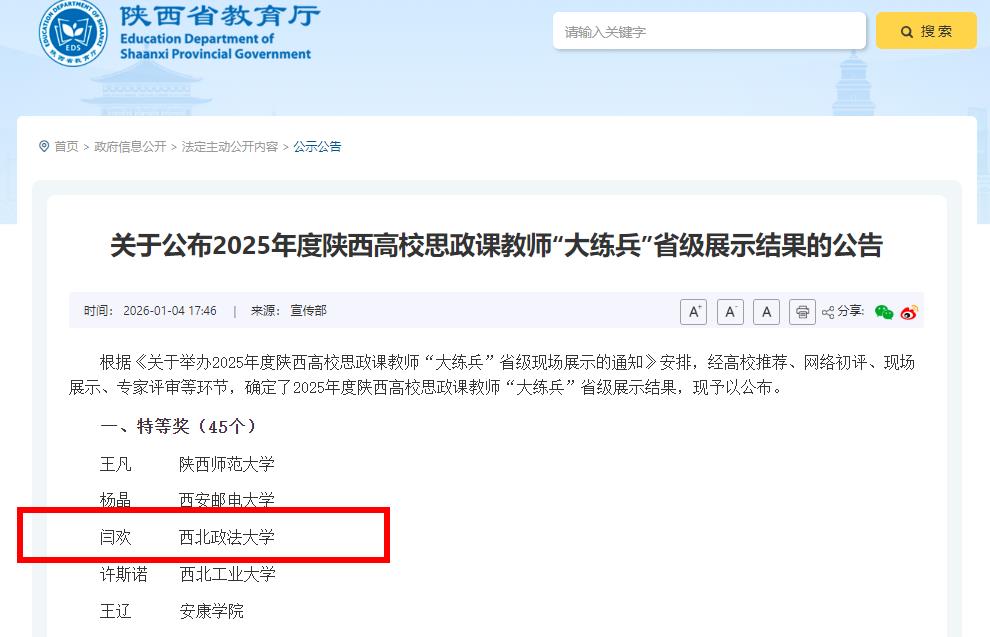 2026年1月4日,中共陕西省委教育工委、陕西省教育厅公布了2025年度陕西高校思政课教师“大练兵”省级展示结果,经高校推荐、网络初评、现场展示、专家评审等环节,笔趣阁